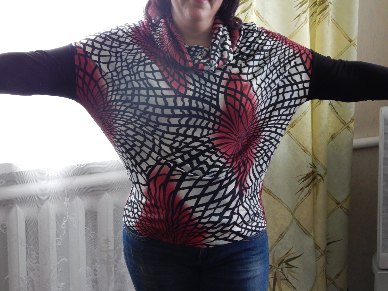 Галочке я пошила из трикотажного полотна в составе которого хлопок и лайкра.Рукава сделала из однотонного масла.Я думаю это лучше чем полностью цветной блузон,да мне ткани и не хватило бы .А так куски черного масла пригодились.